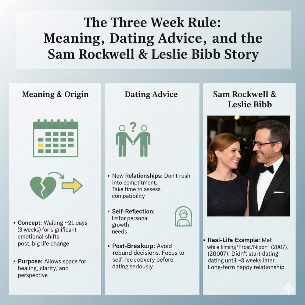 In this guide, you will learn the true meaning behind the three week rule. You will also discover the famous story of Sam Rockwell three week rule and how Leslie Bibb three week rule became part of pop culture. By the end, you will know how to use this idea wisely in your own dating life.